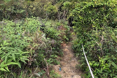 途中コンクリートで舗装されたトレイル横に紐がぶら下がっており、その先には下に続く急な道があった。よくよく地図を見ると どうも墳場への入口道路付近で近道の案内があった道と繋がっている様子。間違って登ってくる人がいないのか心配になる。