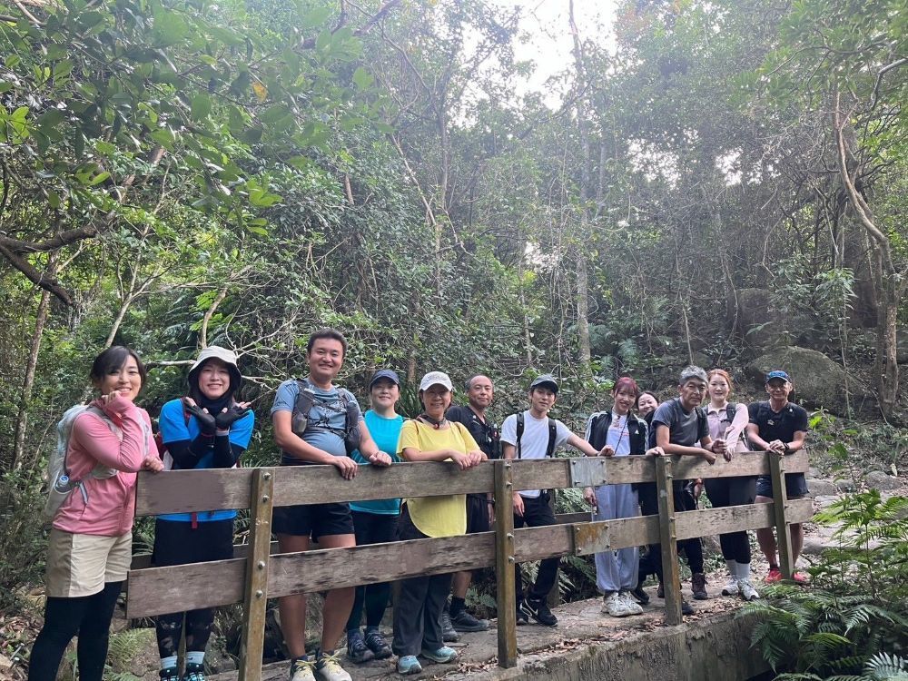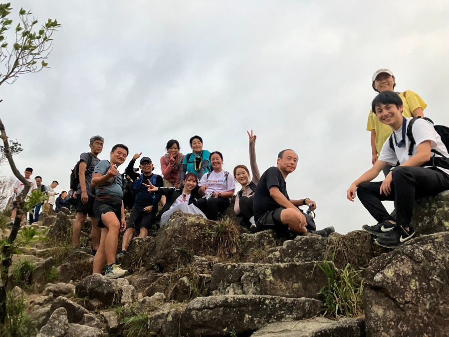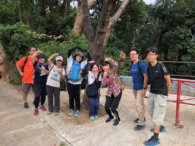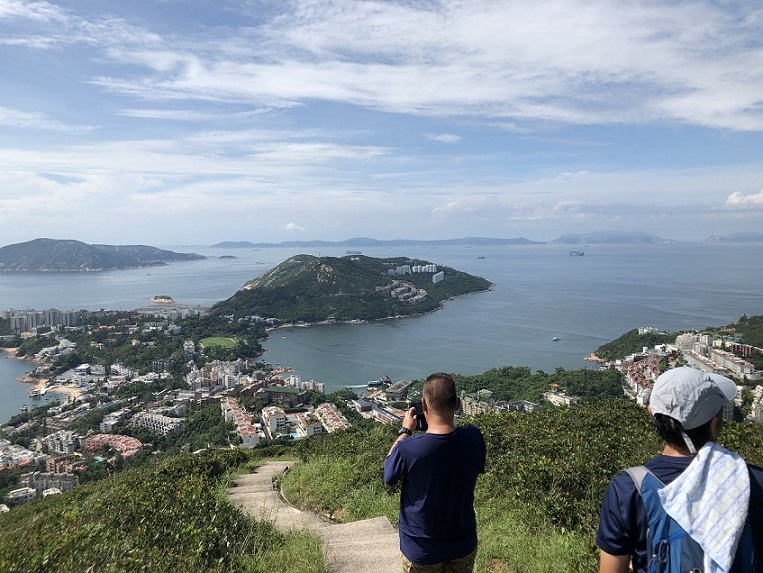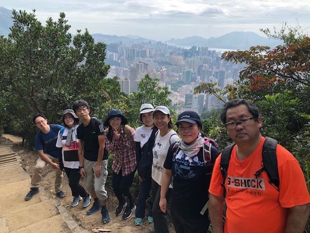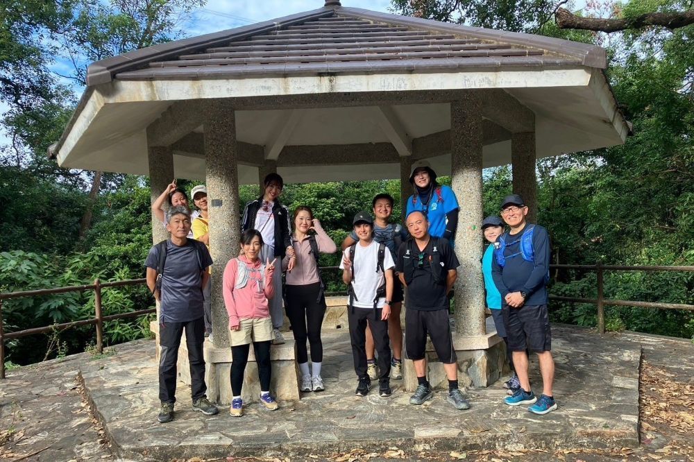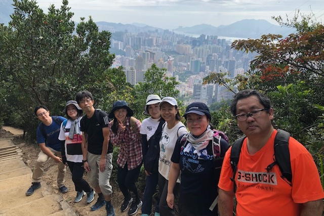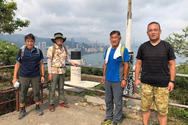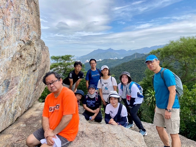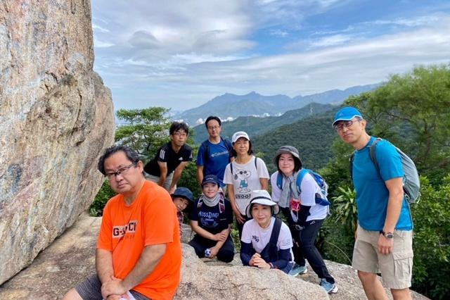 さらに登り進め、Wilson Trail Section 9に合流し、いよいよ屛風山に登頂します。山頂付近は足場が悪く、少々藪もあるため、屛風山に登頂するチームとそのままWilson Trailを進むチームに分かれる予定でしたが、なんと全員が登頂希望!企画者としては嬉しい限りで、全員で山頂に向かいます。Section 9の分岐から屛風山までの高低差は50mもありません。しかしその50mの差が大きく、一気に視界が開け、360度の景色が広がります。その景色を見て、参加者に笑顔が溢れます。そうそう、その顔が見たくてこのコースを選んだんです。ふふふ。