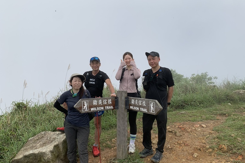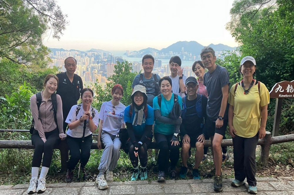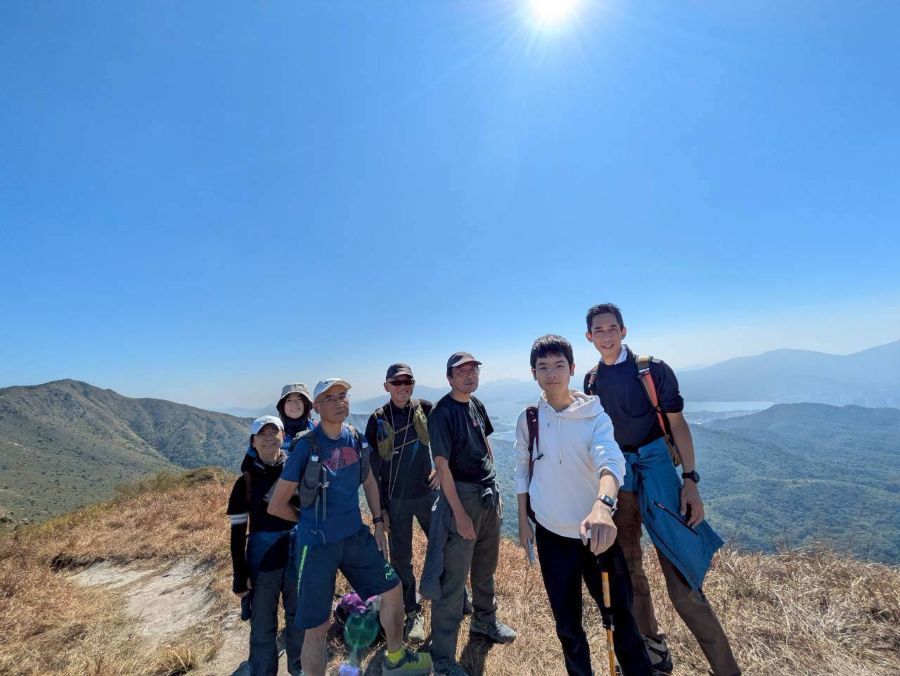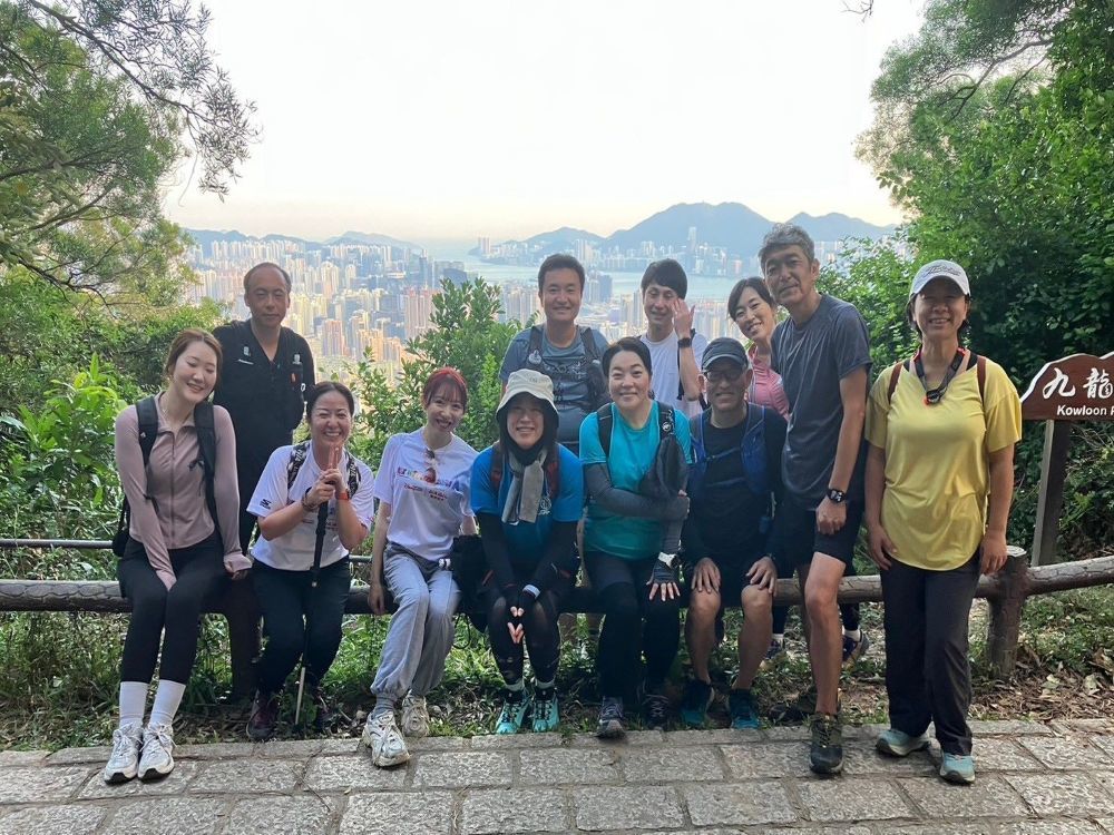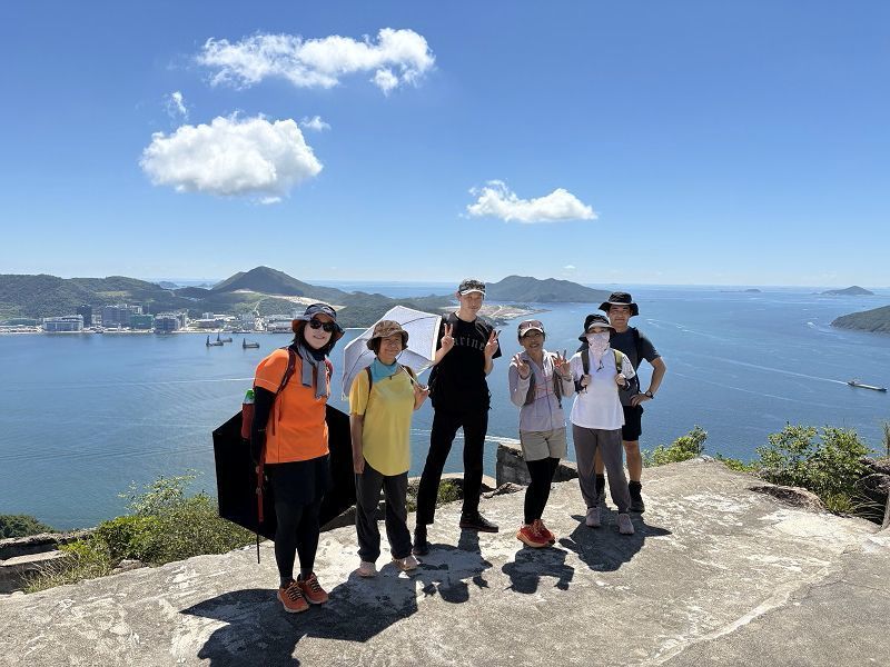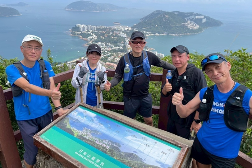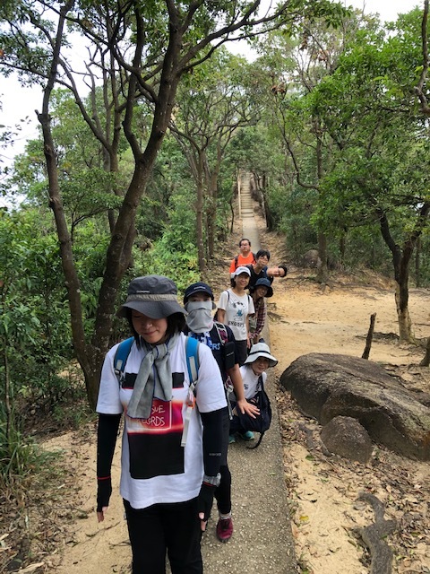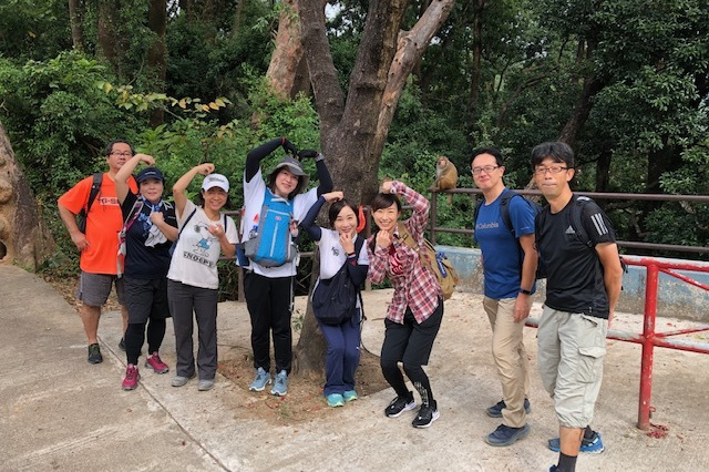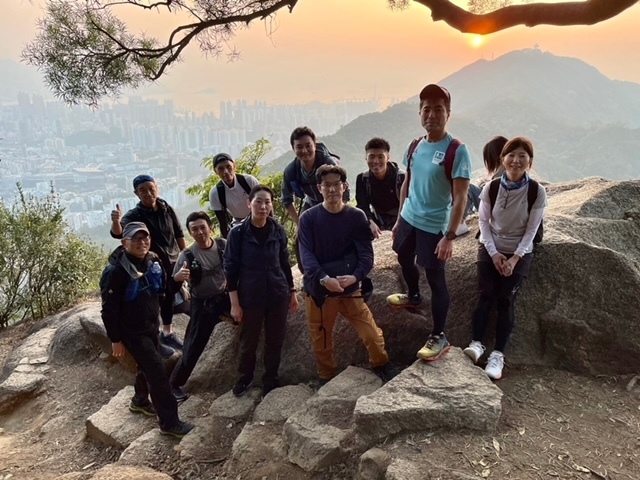 さらに登り進め、Wilson Trail Section 9に合流し、いよいよ屛風山に登頂します。山頂付近は足場が悪く、少々藪もあるため、屛風山に登頂するチームとそのままWilson Trailを進むチームに分かれる予定でしたが、なんと全員が登頂希望!企画者としては嬉しい限りで、全員で山頂に向かいます。Section 9の分岐から屛風山までの高低差は50mもありません。しかしその50mの差が大きく、一気に視界が開け、360度の景色が広がります。その景色を見て、参加者に笑顔が溢れます。そうそう、その顔が見たくてこのコースを選んだんです。ふふふ。