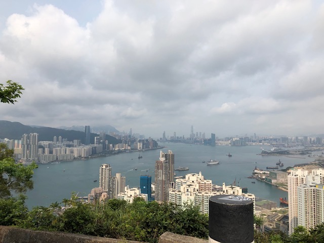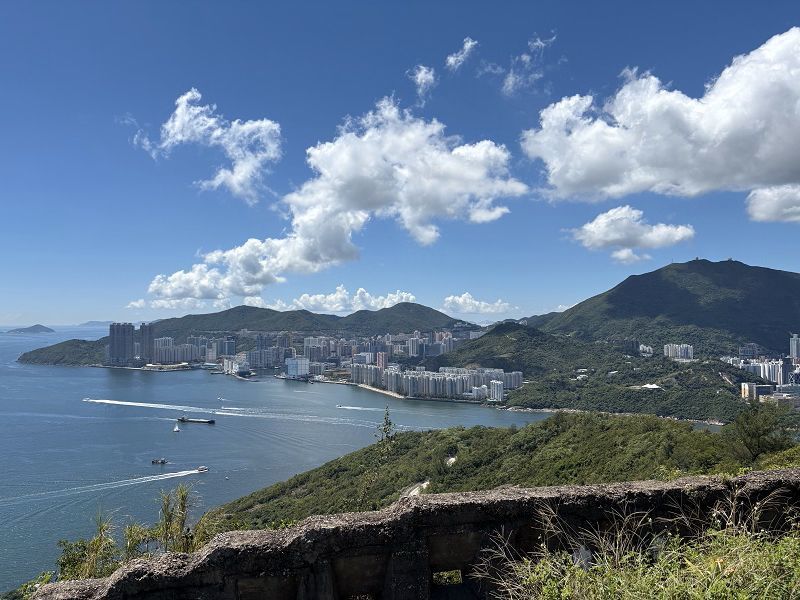 ここから山歩スタート。しばらく階段が続きますが、ゆっくり上り15分ほどでウィルソントレイルSec3の平らな道に合流。右側に油塘の街並みを見ながら10分ほど進むと、左手に海側の絶景と墓地が見える広場に出るので小休止。