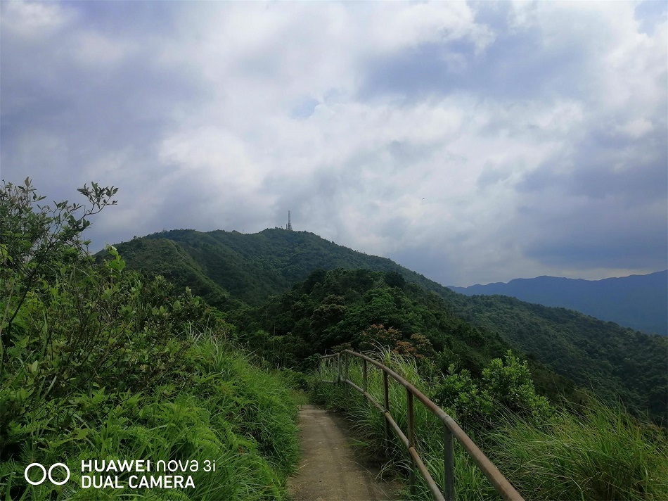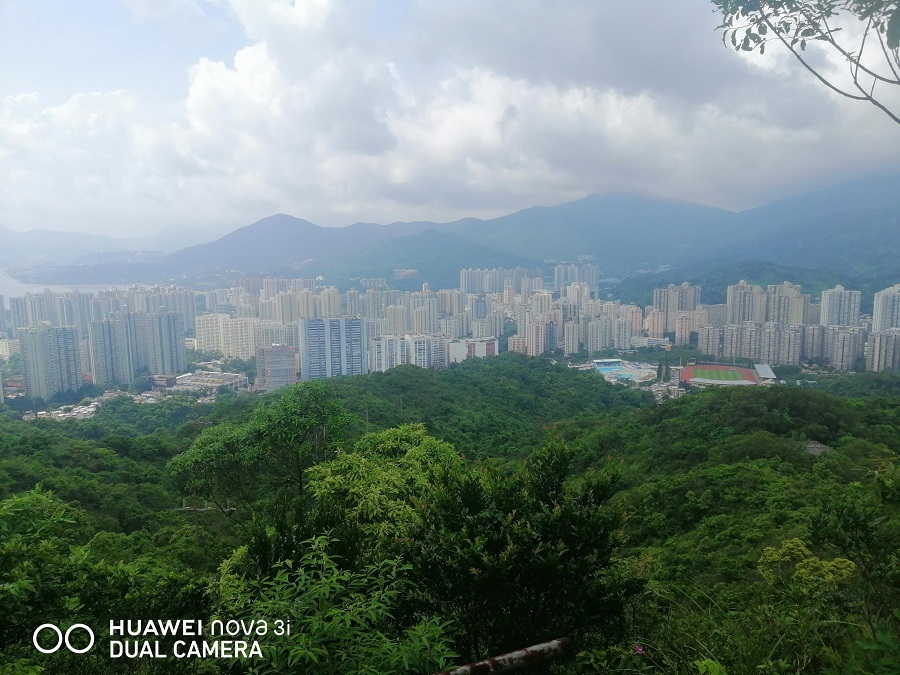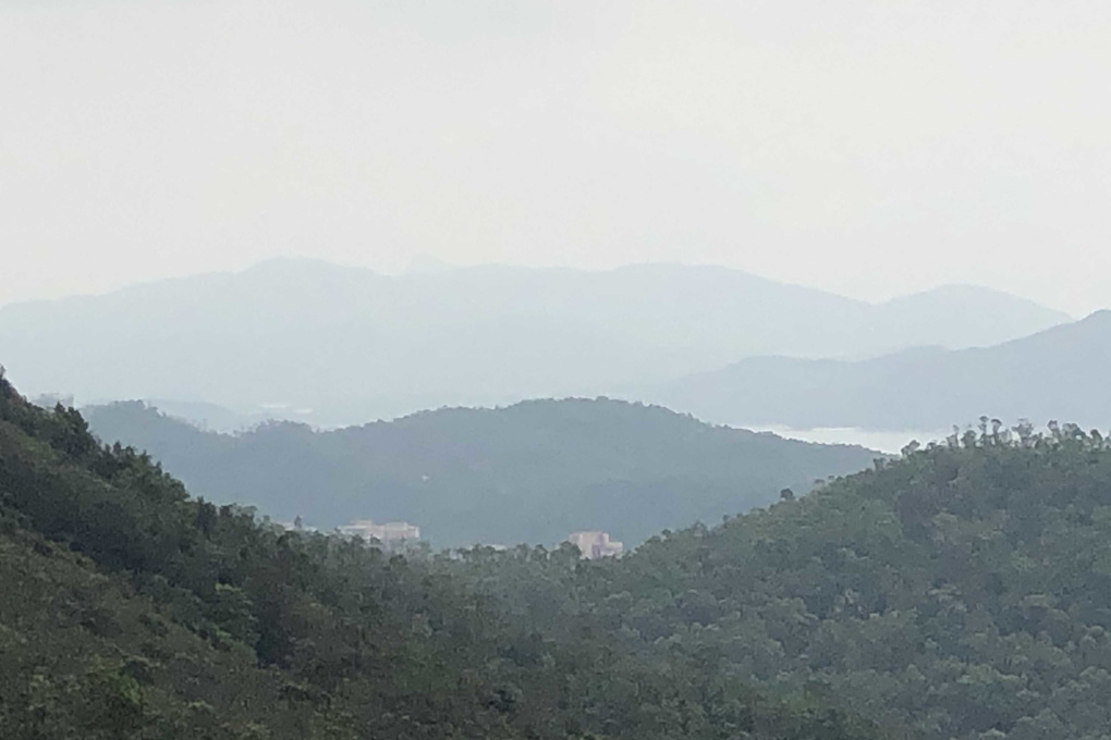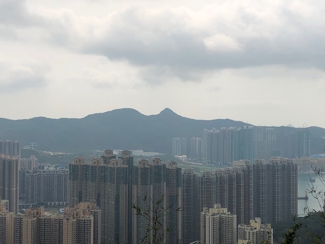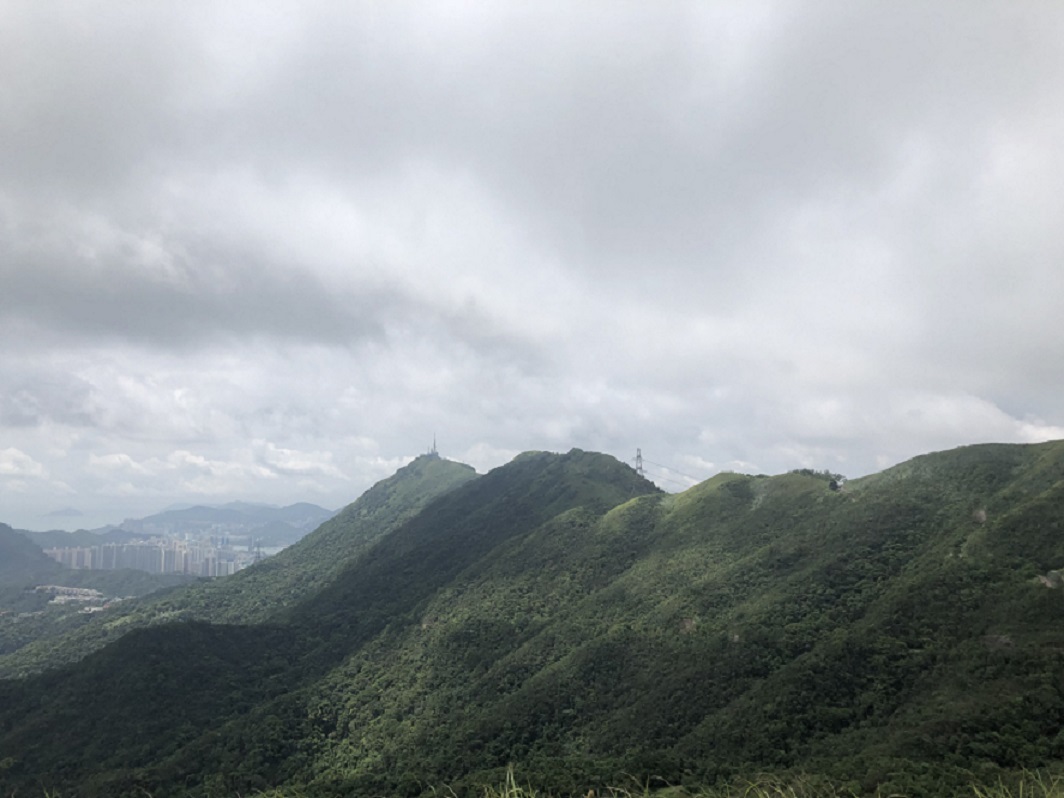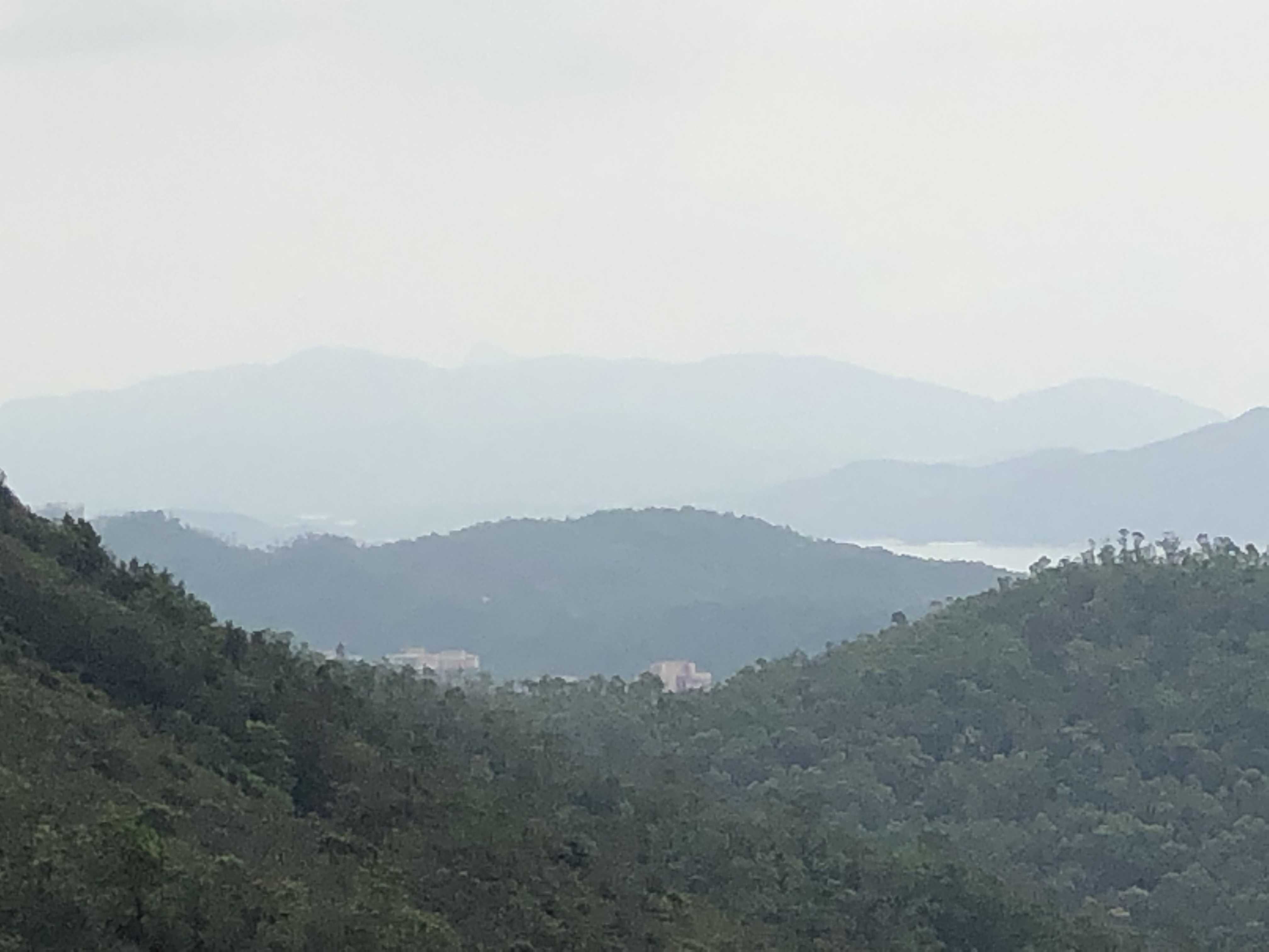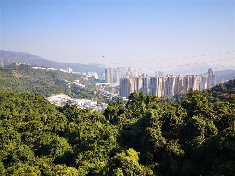 400m程登ると少し下りに入ります。毎度せっかく稼いだ標高が失われる感覚は悲しいものがありますが、これも次に飛躍するための欠かせないステップです。平頂坳の分岐から、最後の登りです。分岐に入ってすぐに蜂の巣があるのでご注意を。刺激しないようにゆっくり進みます。振り返ると既に林は抜けており、New Territoriesと深圳の景色が広がっていました。