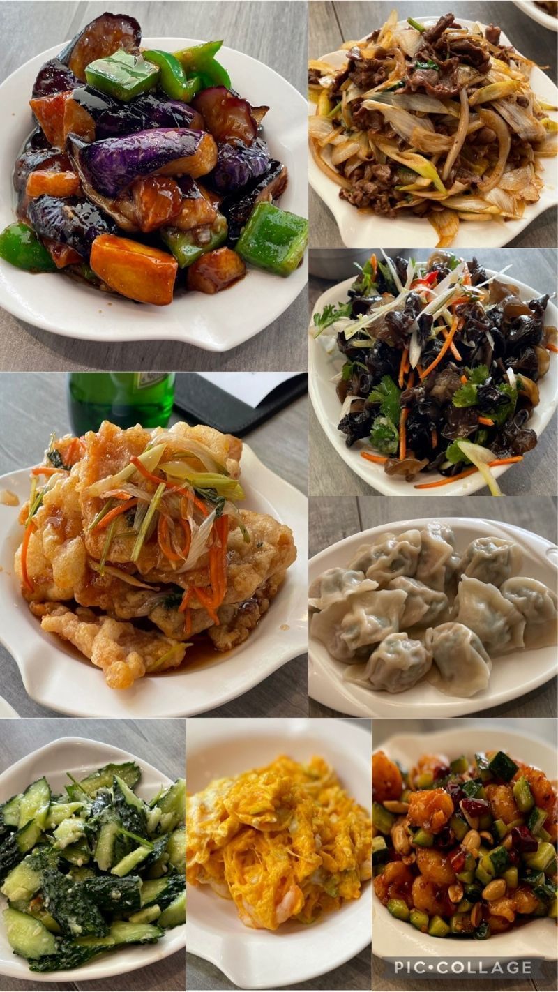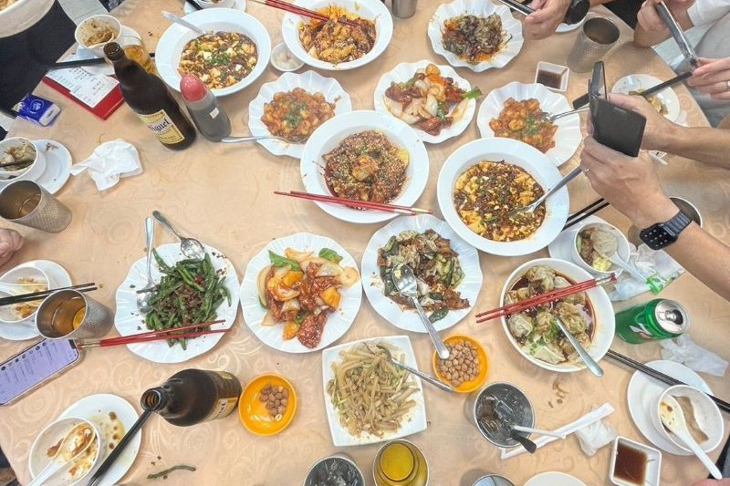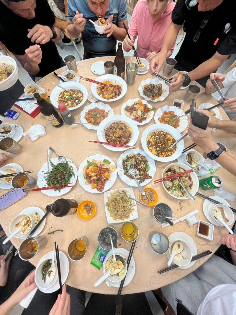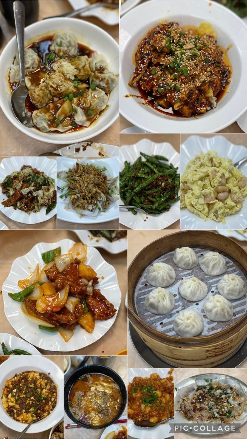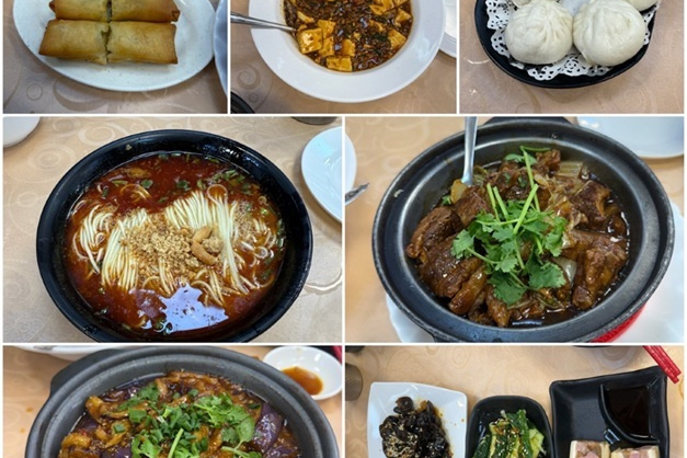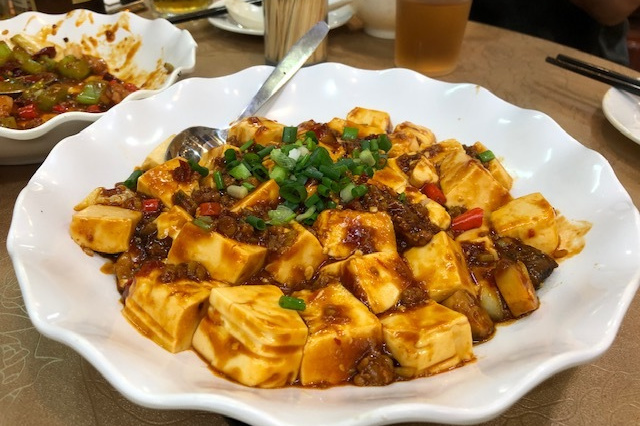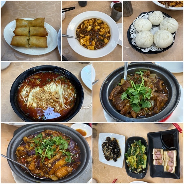 青島ビール(5本)に担々麺、麻婆豆腐、春巻、魚香茄子、牛筋腩煲、キュウリときくらげの前菜、鎮江肴肉、デザートに豆沙鍋餅、マイタンは727香港ドル。