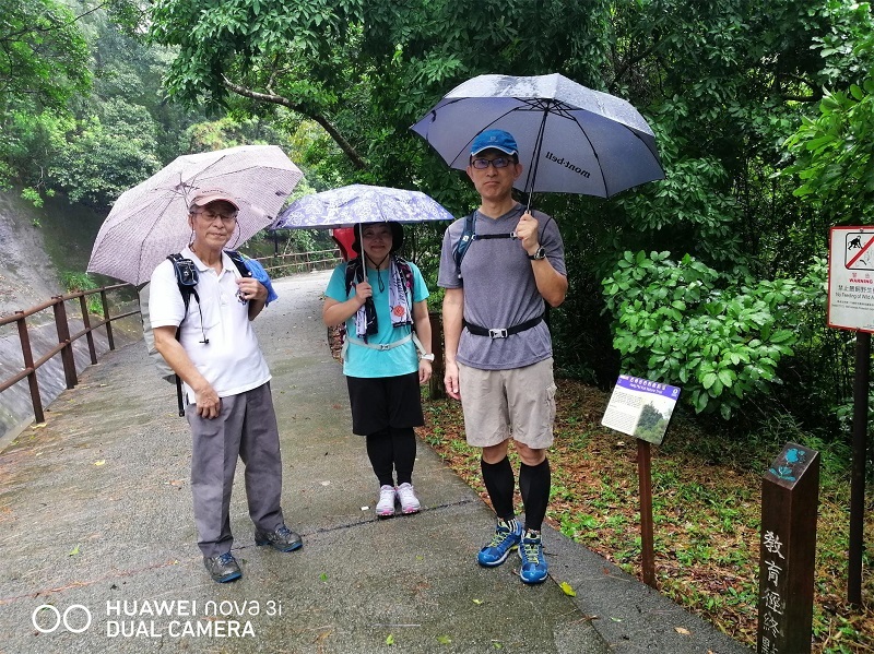 11時過ぎには雨雲がくるという天気予報が嘘のように、東洋山への登りは日差しと暑さが厳しく、少し休息を入れながら歩くことになりましたが、東洋山の山頂についた頃には、予報通りに雨雲が近寄っているような湿っぽい風と、実際に西の方からは雷雲が近づいてくる様子が見えました。其処からは、雨に降られないように先を急いだのですが、沙田パスを下る途中で、案の定、雨が降り出し、傘をさして今日の打ち上げ場所の黄太仙四川食堂へ向かう事になりました。12時頃にはお店に到着し、席は大分空いていたので待つことなく席に付く事ができました。