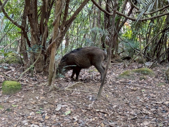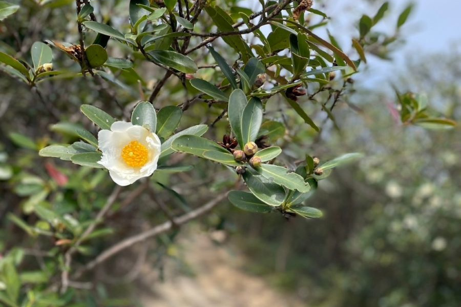 今回は一つのピークを目指して登り降りをする登山らしい登山です。そのため開始早々に急登が続きます。1月だというのに気温は20℃を超え、木々に視界を遮られながら、階段の道を登っていきます。林の隙間から遠方の景色を感じつつも、なかなか出し惜しみをされているようでした。