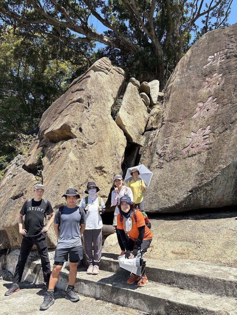 少し進むと魔鬼山への分岐があり、階段の後はロープの張ってある山道を登ります。徐々に景色が良くなり11時頃山頂へ到着。日差しが強いものの、時折風が吹いて心地よく、それぞれ砲台跡地の散策や写真撮影をしながら休憩をとります。