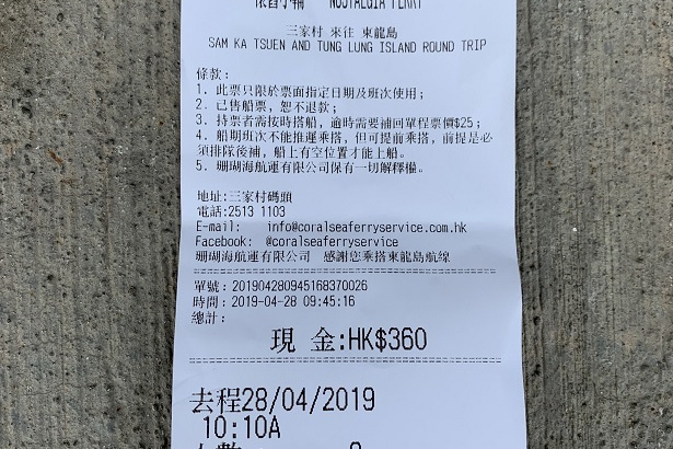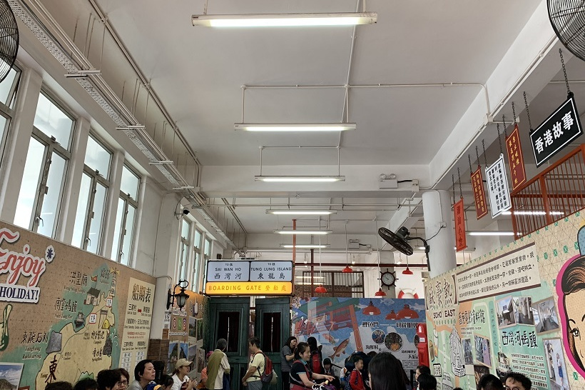 帰りの時間を決めて往復乗船券(45ドル)を買うシステムで、遅めの時間にしておき、予定が早まって席があれば前の時間に乗ればよいとのこと(米田さんご確認いただきありがとうございます)。運航は西灣河と三家村や觀塘の渡しもしている珊瑚海(Coral Sea Ferry)で、パンフレットも用意しており懐古調(ノスタルジック)な船のデザインが売り。流行りの柴犬サークルのグループもいる(動物・自転車は往復20ドル)。乗船券はレシートのように打ち出すようになり、待合には釣り道具ショップがある。10:10発に乗船し所要30分で東龍洲・南堂碼頭着。