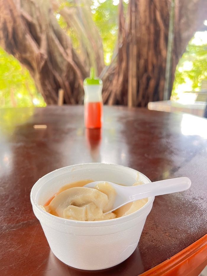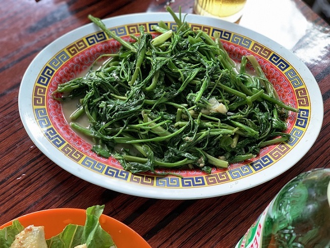 英語も話すお姉さんが呼び込みをしていて明るいテラス席だったので入ることに。まるで猫カフェのように数匹の猫がテーブルの周りでのんびりしている。どのお店も海鮮のような料理はやっておらず麺などの軽食中心だがビールはある。炒飯、炒米粉、チキンウィング、野菜を頼もうとしたら「おんちょいong3 choi3」があるとのこと。お勧めなので頼んでみると横の畑で収穫して調理してくれた。大八木さんが発音からネットで調べたところ蕹菜(ヨウサイ)、いわゆる通菜・空心菜のよう。味は少しクセがあったけれどもご飯が進む味付けで美味しかった。時間があったのでメニュー充実のデザートも追加。米田さんは陳皮海帯緑豆沙、室伏さん・川島さん・島田さんは芝麻糊、残りの4人は紫薯椰汁西米露。このお店は自家製デザートに定評があるよう。マイタンは699ドルで、青島大瓶の値段はメニューになかったけれど25ドルくらい。飲み物を頼んだ人90、頼まなかった佐藤さん70、お釣り1ドルは置いてきました。15時すぐそばの船着き場へ下り、15:20の船で三家村へ戻り(15:50着)解散。