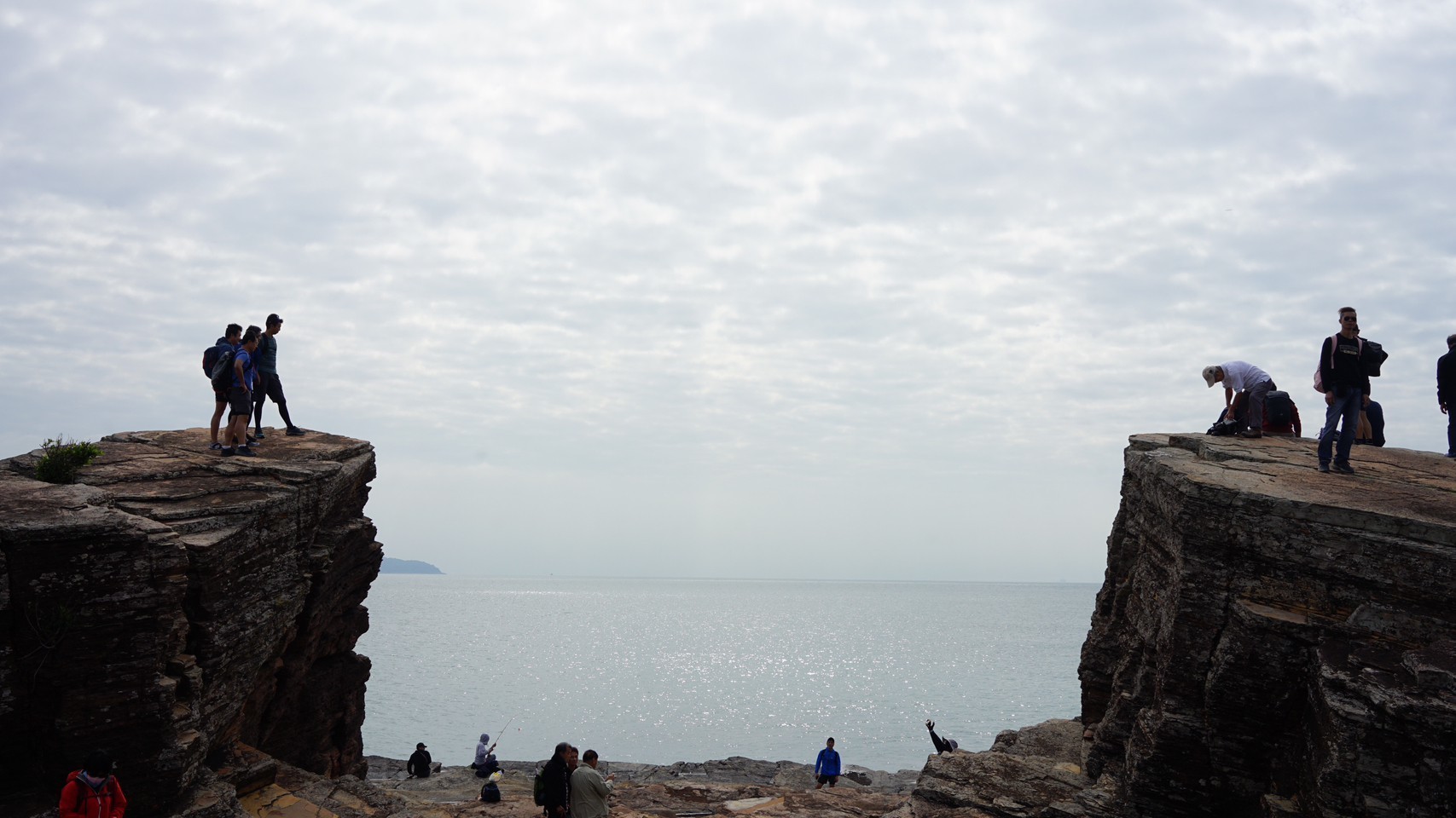 11半過ぎ絶景下り階段で撮影し11:40鹿頭灣への分岐着。川島さんと小野さんが偵察隊として鹿頭灣方面に行く間、他メンバーは少し登った見晴らしの良い場所で休憩しつつ見守る。鹿頭灣への舗装道の先は行き止まりで、フェンスに囲われた南堂尾無線站がある。走りながら戻ってくる姿を確認し、他メンバーはそこから少し登った東尋坊(のような絶壁)から景色を堪能し2人に追いつかれる前にさらに登り進む。