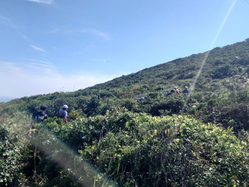キャンプ場でトイレ休憩をとったあと、東龍洲の頂上を目指す。足元はしっかり見えるが急な藪道を頂上手前まで約1時間登ったところで