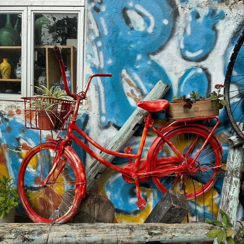 たっぷり休憩した後、健脚組には海辺への寄り道ミッションを課して元来た道を戻る。分岐で再び合流した後は秘密の花園と呼ばれる皮工場の跡地を目指し、市街地へ。ごちゃごちゃしたアートな空間をサラッと見て回り、海沿いへ出たものの暑さが厳しく、バテてきたので大利島の亀石へは元気な方々に行ってもらい、女性と長者は日陰で休憩させてもらうことに。20分ほどで戻って来た探索隊と、打ち上げの飲茶へ。(13:30)